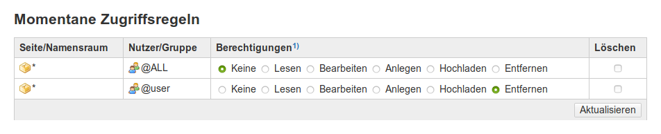 Zugriffsbeschränkungen werden mit Seiten und Namensräumen verbunden. Es gibt fünf Zugriffsrechte: Lesen, Bearbeiten, Anlegen, Hochladen (von Mediendateien) und Löschen. Jedes höhere Zugriffsrecht enthält die darunter liegenden. Dabei ist Lesen das unterste und Löschen das höchste Recht. Die Rechte Anlegen, Hochladen und Löschen können nur Namensräumen zugewiesen werden.