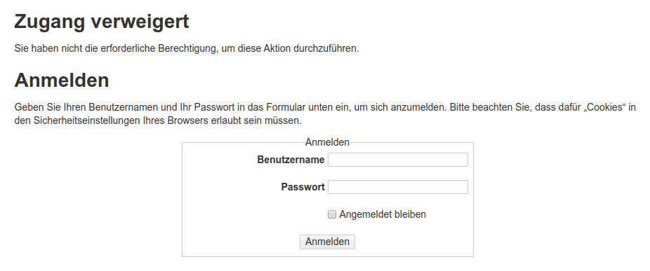 Greift ein angemeldeter Nutzer ohne ausreichende Rechte zu, sieht er nur den Hinweis ohne Anmeldefenster.