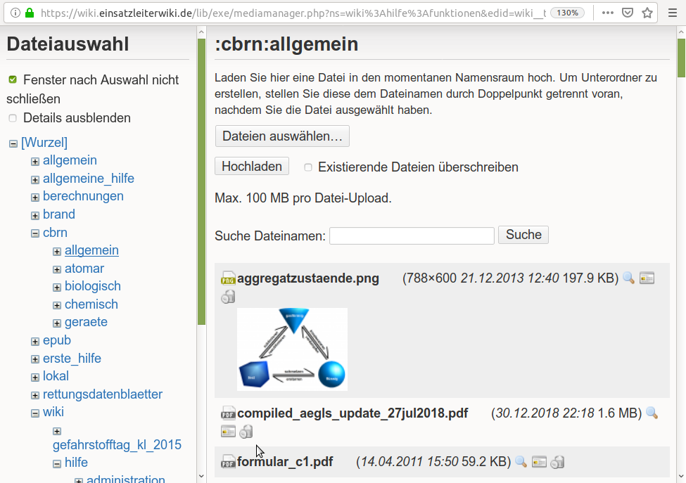 Klicken Sie in der linken Seite auf den Namensraum (und danach ggf. auf Unternamensraum), in welchen Sie die Datei hochladen möchten. Sie können jederzeit als Überschrift der rechten Spalte den aktuell ausgewählten Namensraum ablesen (hier: :cbrn:allgemein).