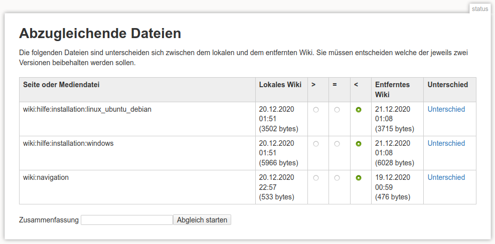 Klicken Sie nun rechts unten auf Speichern. Nach einem weitern Klick auf Abgleich starten wird eine Verbindung zu Ihrem Wiki-Server aufgebaut und Sie sehen wie weiter oben bereits beschrieben die Liste der Unterschiede zwischen Ihren beiden Wikis.