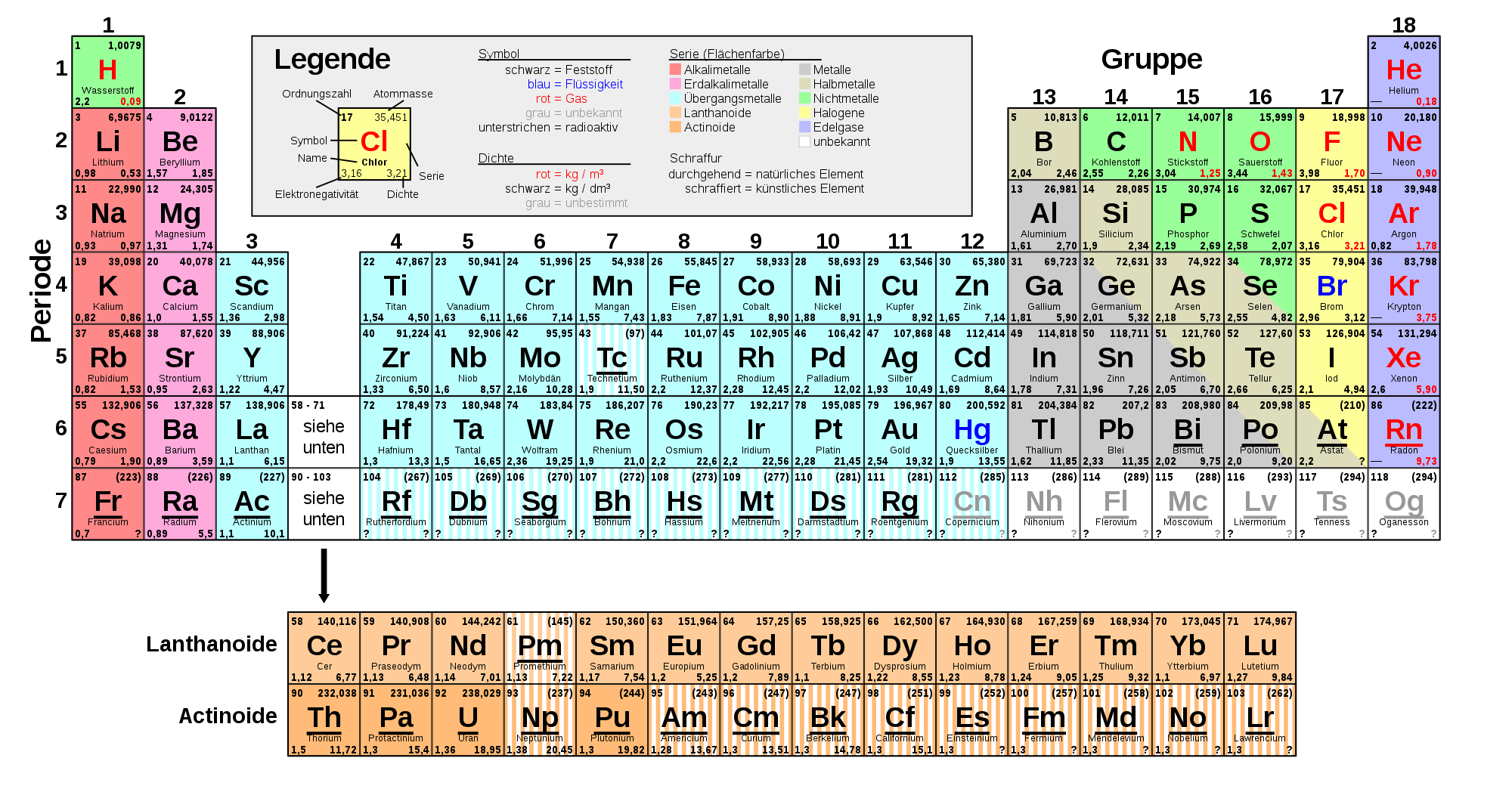 | Elementname nach IUPAC | Symbol | Ordnungs- zahl | atomare Masse (u) | Dichte bei 20 °C (kg/m³) | Schmelz- punkt (°C) | Siede- punkt (°C) |