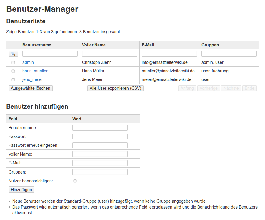 Vom Admin-Menü aus gelangen Sie zum Benutzer-Manager. Hier können Sie Benutzerdaten ändern, neue Benutzer hinzufügen und Benutzer löschen. Außerdem ist ein Massenim- und -export von Benutzern via csv-Datei möglich. Beim Aufruf sieht der Benutzer-Manager beispielsweise so aus: