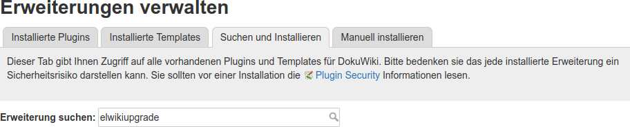 Installieren Sie das Plugin elwikiupgrade, sofern sich dieses noch nicht in Ihrem Wiki befindet. Sollte das Plugin bereits in der aktuellen Version installiert sein, können Sie direkt zum nächsten Abschnitt springen.