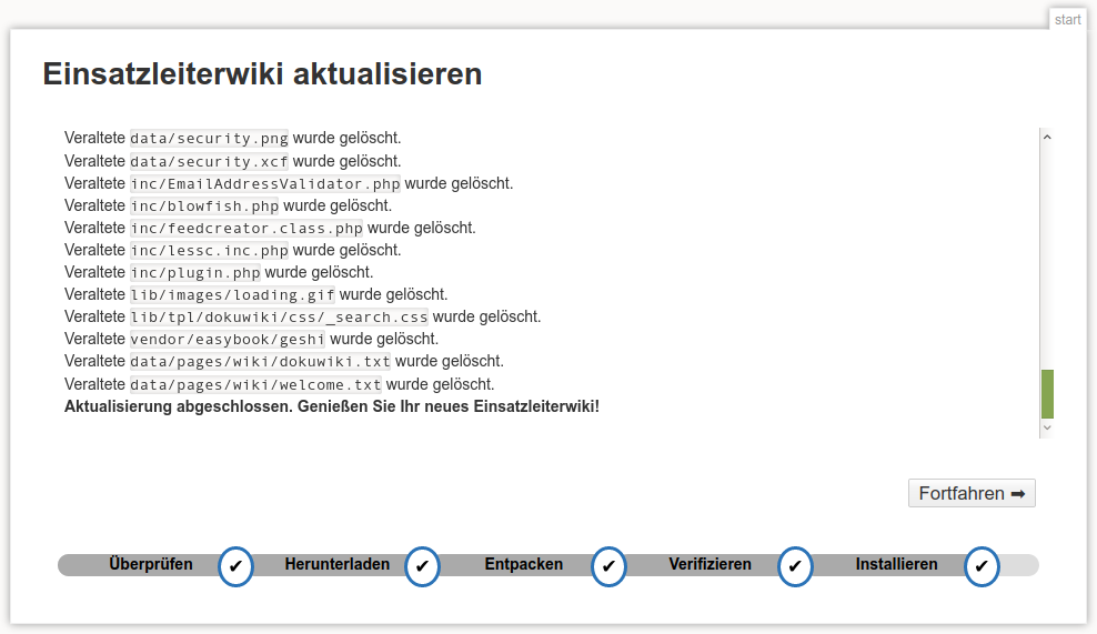 Jetzt wird die aktuelle Version des Einsatzleiterwikis inklusive aller Inhalte installiert. Veraltete Dateien werden automatisch gelöscht. Die Aktualisierung ist damit abgeschlossen. Mit einem Klick auf Fortfahren gelangen Sie zur Startseite. Damit ist die Aktualisierung abgeschlossen.
