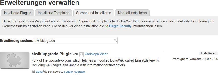 Seit Dezember 2020 wird das Plugin elwikiupgrade in der Einsatzleiterwiki-Installation mitgeliefert. Haben Sie Ihr eigenes Einsatzleiterwiki nach Dezember 2020 installiert, müssen Sie die folgenden Schritte nicht durchführen.