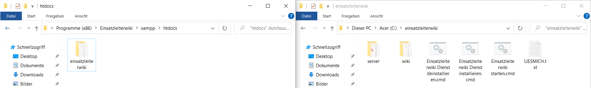 Öffnen Sie in einem zweiten Windows-Explorer-Fenster Ihr bisheriges Einsatzleiterwiki-Installationsverzeichnis. Öffnen Sie darin den Unterordner xampp, und darin den Ordner htdocs. Dies sollte nun wie folgt aussehen (hier wurden beide Explorer-Fenster nebeneinander gelegt:
