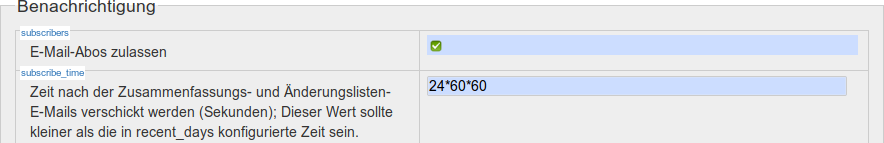 Abonnements sind nicht standardmäßig aktiviert, da sie bei großen Wikis den Mailserver stark belasten können. Sie müssen in der Konfiguration im Abschnitt "Benachrichtigung" zuerst aktiviert werden bevor sie benutzt werden können.