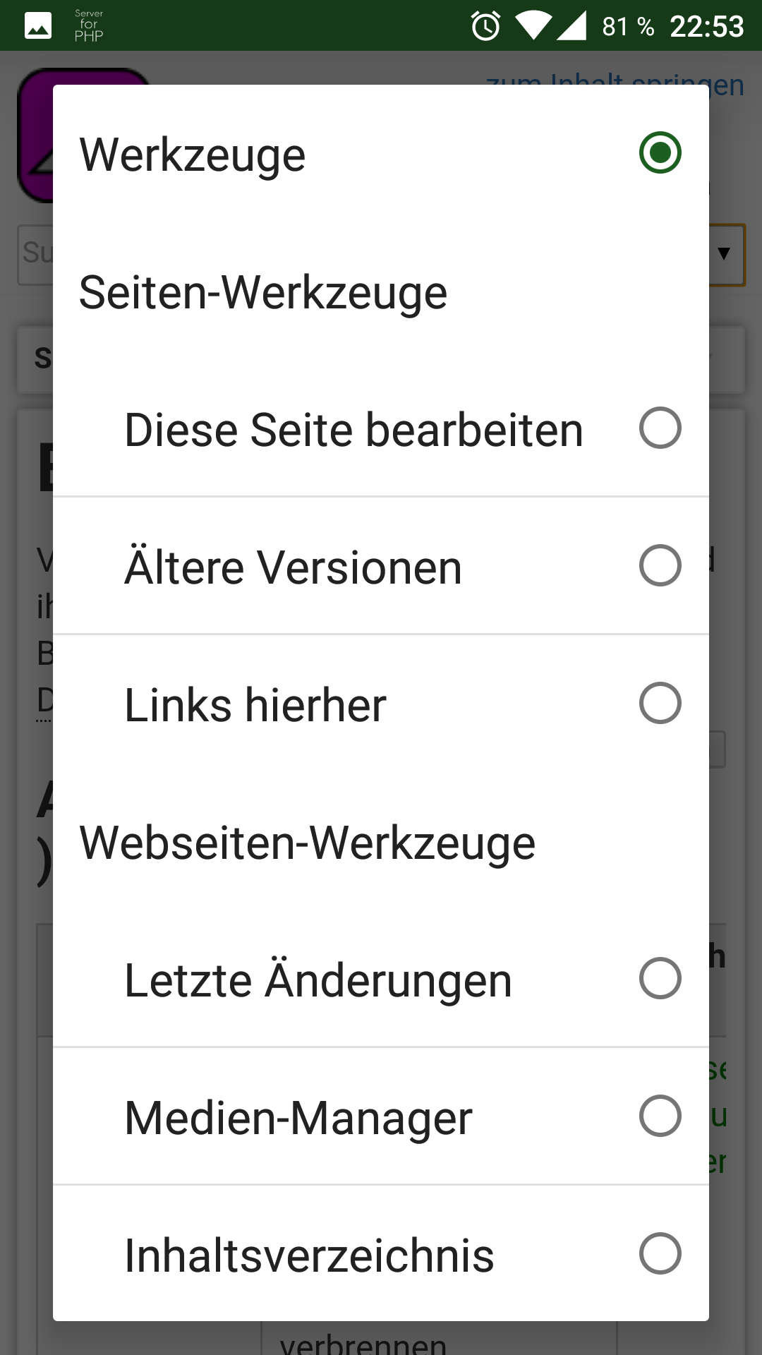 Das mobile Design ist sehr platzsparend bzw. übersichtlich angelegt. Die meisten Funktionen sind daher standardmäßig verborgen. Klicken Sie im oberen Bereich auf die Schaltfläche Werkzeuge, um die verborgenen Funktionen wie im nebenstehenden Bild anzuzeigen (u.a. auch die Anmeldung für das Wiki). In der Liste kann hinauf- und hinuntergescrollt werden.