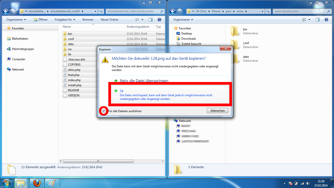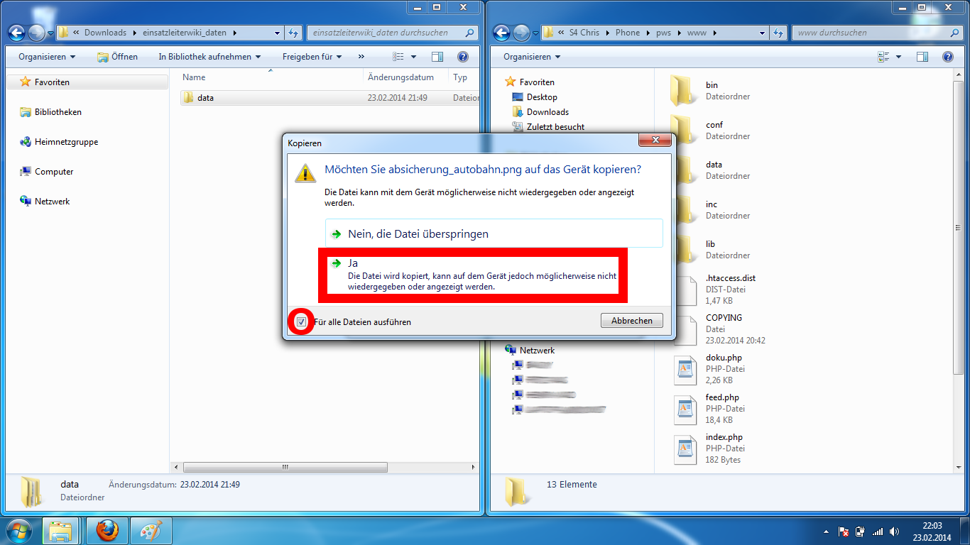 Wie auch schon beim Kopieren der Wiki-Software erhalten Sie ggf. auch hier wieder eine Nachfrage ob Sie die Dateien wirklich kopieren möchten weil diese evtl. nicht auf diesem Gerät wiedergegeben werden können.