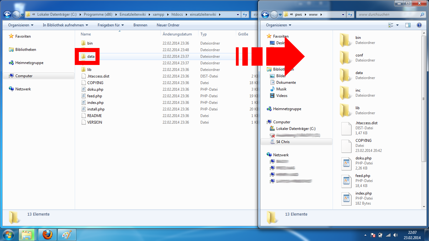 Wichtig: Kopieren Sie wirklich nur den Ordner data und keine der anderen Dateien/Verzeichnisse. Ihr mobiles Einsatzleiterwiki wird sonst nicht fehlerfrei funktionieren!