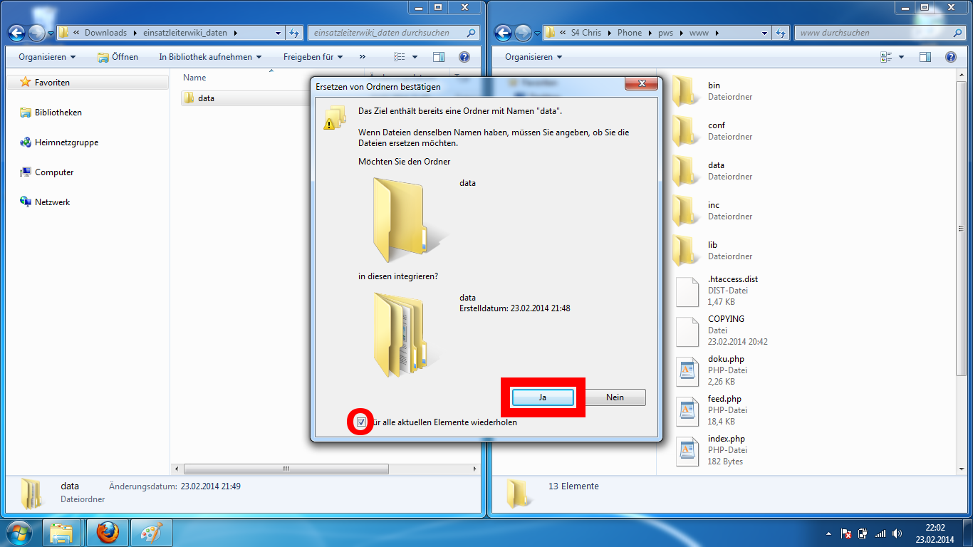 Sie erhalten nun eine Nachfrage, ob Sie den Ordner in den bereits vorhanden data-Ordner integrieren möchten. Setzen Sie einen Haken bei Für alle aktuellen Elemente wiederholen und klicken Sie danach auf ja.