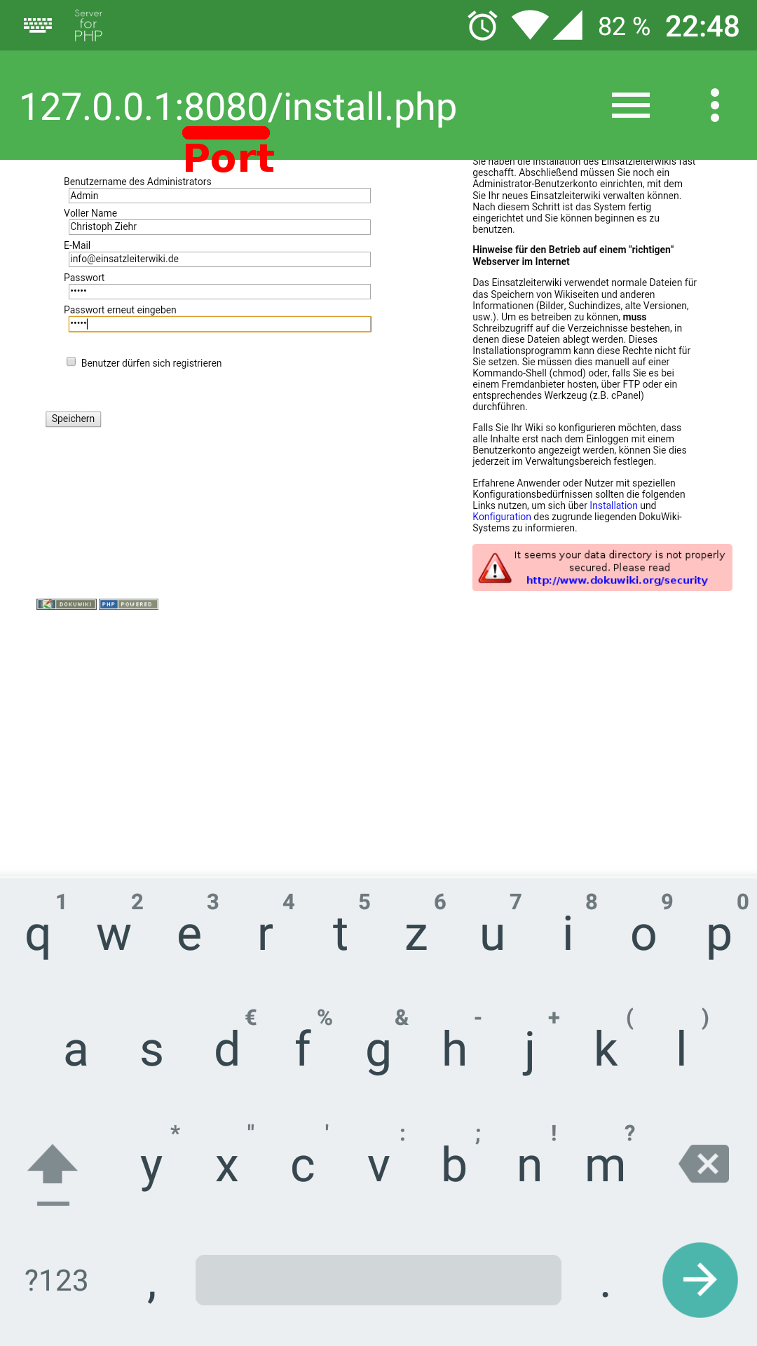 Zuletzt müssen Sie noch das Wiki konfigurieren. Rufen Sie dazu im Browser Ihres Handys die Adresse http://localhost:8080/install.php auf (8080 beschreibt den Port, falls Sie im Anfang bei der Konfiguration diese Einstellung geändert haben. Wenn nicht, dann lassen Sie 8080 stehen.). Nun öffnet sich das Installationsfenster.