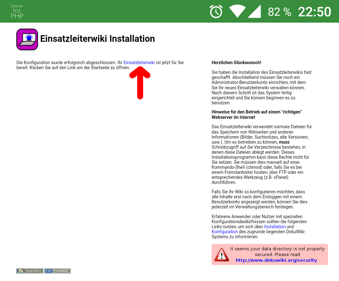 Wenn Sie diese Seite sehen, war die Installation erfolgreich. Klicken Sie auf den Link Einsatzleiterwiki um die Startseite zu öffnen.